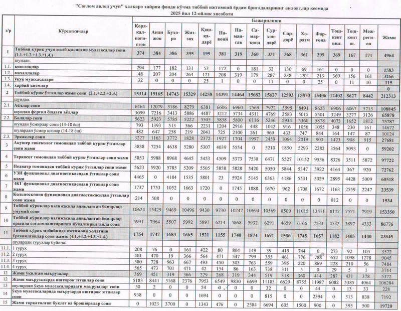 Международный благотворительный фонд „Соглом авлод учун“: отчет за 12 месяцев 2025 года о деятельности выездных медицинских социальных бригад в разрезе областей
