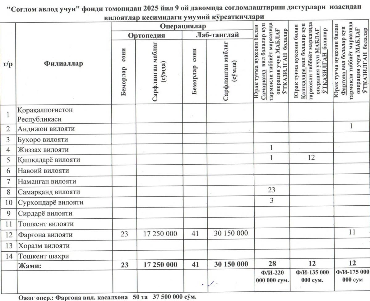 "Соғлом авлод учун" фонди томонидан 2025 йил 9 ой давомида соғломлаштириш дастурлари юзасидан вилоятлар кесимидаги умумий кўрсаткичлари
