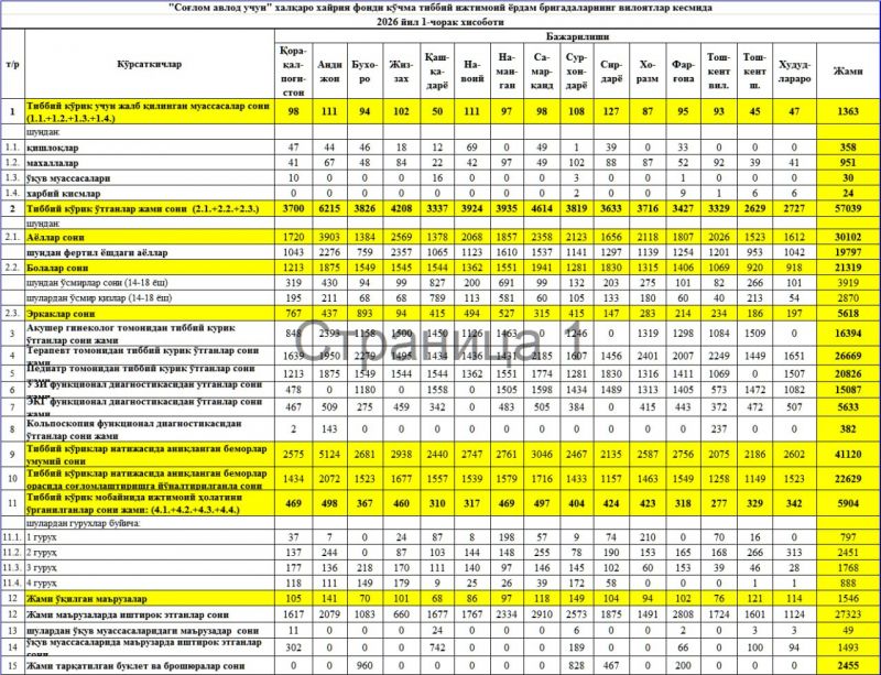 "Соглом авлод учун" халкаро хайрия фонди кучма тиббий ижтимоий ёрдам бригадалариниг вилоятлар кесмида 2026 йил 1-чорак хисоботи