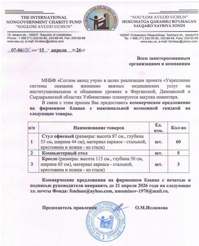 МНФ «Соғлом авлод учун» томонидан «Фарғона, Жиззах ва Сирдарё вилоятларида институционал ва жамоа даражасида ҳаётий муҳим тиббий хизматлар кўрсатиш тизимини мустаҳкамлаш» лойиҳасини амалга ошириш доирасида инвентар харид қилиш режалаштирилмоқда.